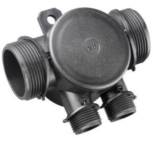 Asymmetrical 4 junction compression fitting. These fittings are designed for use with all types of unslit Harnessflex conduit, maintaining maximum conduit bore.